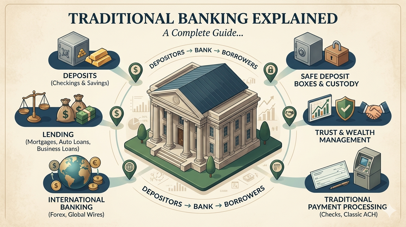 Learn what traditional banking is, how it works, its key features, benefits, and limits. Discover how banks manage money, loans, savings, and financial security in 2026.